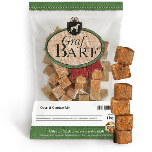 Dieser leckere Mix eignet sich bestens für alle Hunde, in deren Barf-Plan Obst und Gemüse nicht fehlen darf.